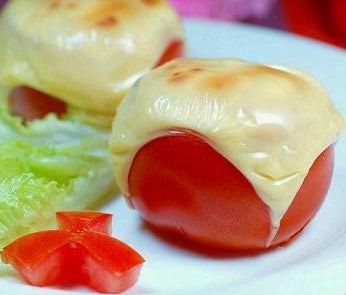 5、奶酪片盖在番茄上。西式吃法。从番茄里挖出的籽可以炒蛋,或是熬汤。